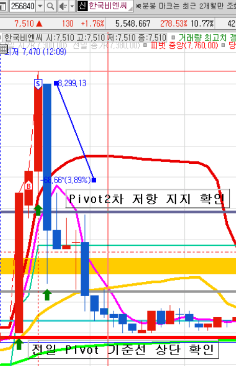 저의 경우는 전일 Pivot 기준선을 기준으로 종목 접근을 우선적으로 고려하며 그 이후에 슈팅이 나왔을 때에는 위의 저항을 잘 넘기는지를 판단하여 매도 타이밍을 잡습니다.