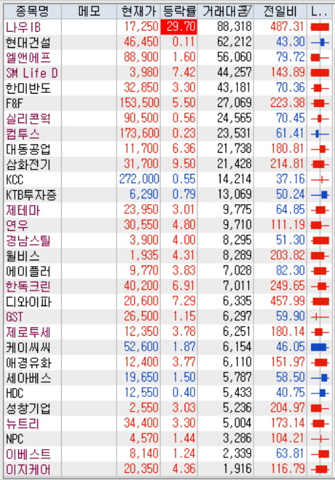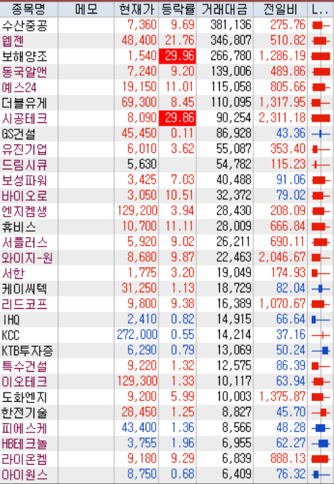 고점돌파 종가배팅 보다는 관심 종목의 장초반의 움직임을 보고 따라 들어가는 방법으로 접근을 바꾸려고 하며 대상 관심종목은 아래와 같습니다.