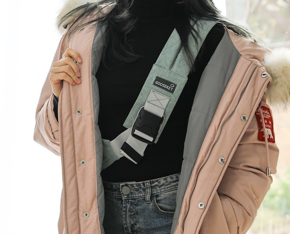 그런데 이 제품의 경우 접었을 때 파우치에 들어가는 정도 사이즈가 되고 가슴에 두르고 다녀도 크게 부담이 되지 않습니다. 예전에 유행하던 크로스백을 걸친 느낌과 유사합니다.