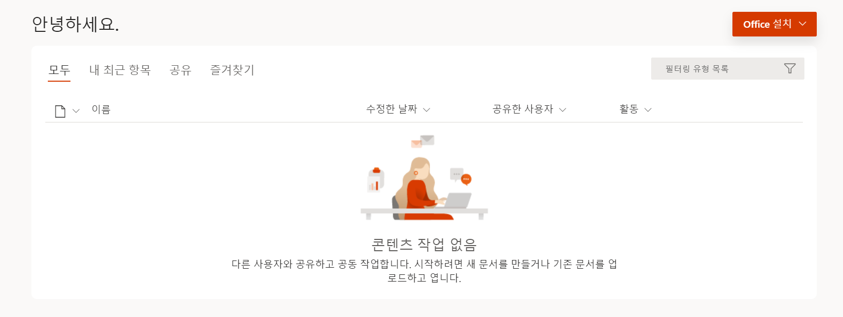 우측 상단에 Office설치 버튼이 활성화 되고 클릭하면 설치 파일이 다운로드 되며 설치하시고 사용하시면 됩니다.