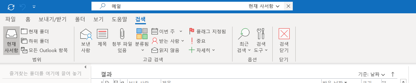서론이 길었네요. 그래서! 아웃룩을 설정을 하고 사용을 하는데 검색 기능이 안보이더라구요.