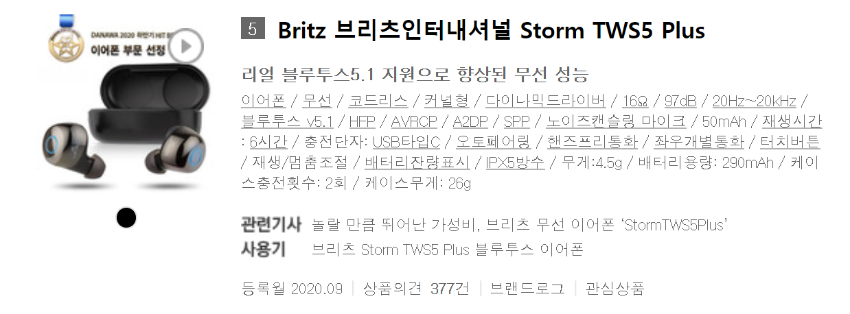 Britz 브리츠인터내셔널 Storm TWS5 Plus : 통화성능은 형편없으나 가격대비 뛰어난 음질을 가지고 있음