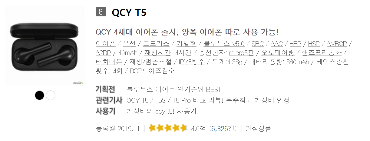 QCY T5 : 오픈형으로 조용한 곳에서는 준수하지만 귀에서 빠지기도 하고 야외에서는 통화가 어려움